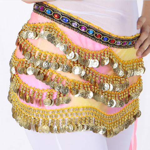 Venta al por mayor de ropa de rendimiento para adultos envoltura de entrenamiento de danza del vientre con bufanda de cadera de diamantes de imitación de colores y Moneda de espera