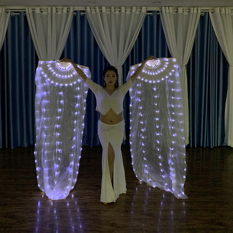 180Cm 1 Paar Witte Kleur Lange Bamboe Zijde Fans Met Led Licht Voor Buikdans Performance Prop Accessoire