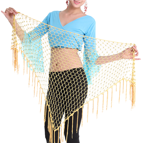 Vente en gros de foulard en résille crochet triangulaire pour la taille et la danse du ventre avec frange scintillante